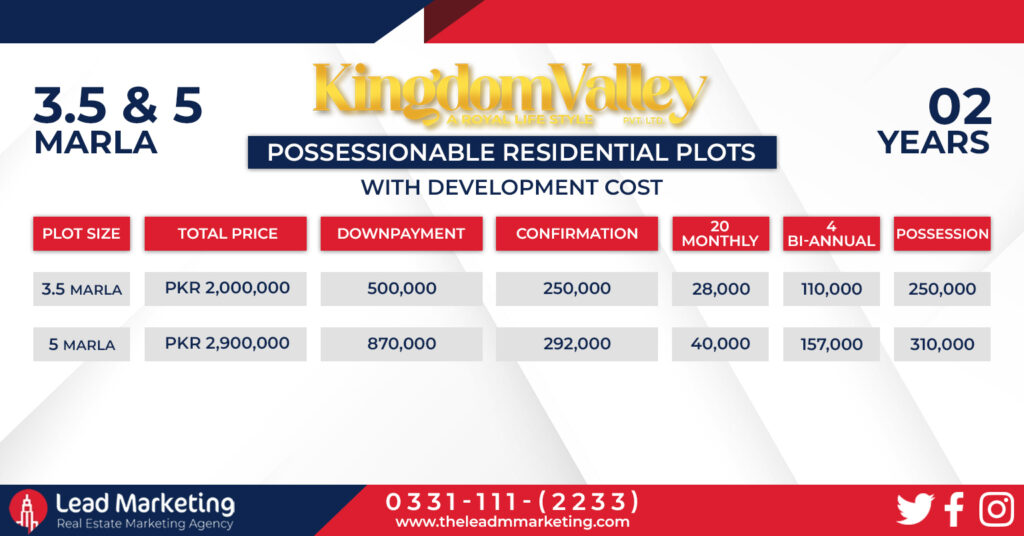 With two plot sizes available, 3.5 Marla and 5 Marla, Kingdom Valley Islamabad makes it simpler for a larger spectrum of buyers to make investments. Below is a comprehensive breakdown of the payment plan:
